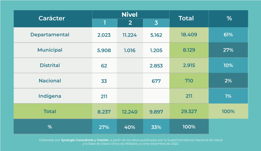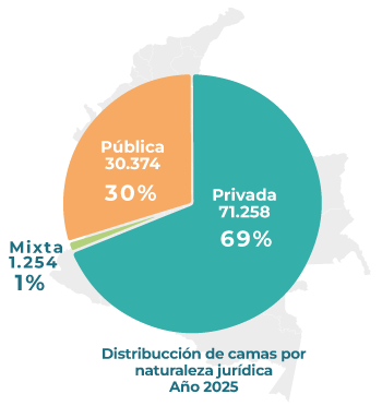 En Colombia se encuentran habilitadas 102.886 camas entre todos los prestadores. De estas, el 69% se encuentran en prestadores privados y el 30% en prestadores públicos. De las camas en prestadores públicos, el 61% se encuentran en prestadores de carácter departamental y el 40% en prestadores de nivel 2.
